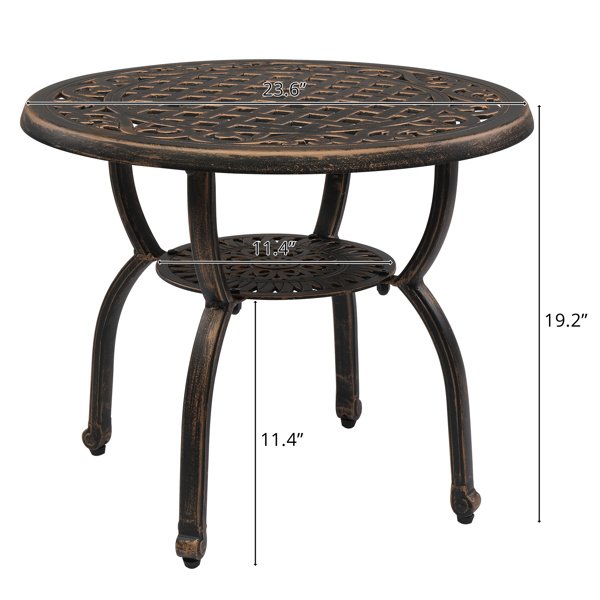 Elevate the aesthetics of your outdoor space with the exquisite design and captivating beauty of this Cast Aluminum Outdoor Side Table. Crafted with meticulous attention to detail, this table features an enchanting hollowed pattern on the tabletop, creating a stunning focal point that will impress your guests. The antique bronze finish adds a touch of vintage charm, while the sturdy cast aluminum construction ensures durability and longevity. Whether placed on your garden, porch, balcony, or indoor area, this table effortlessly blends elegance with functionality.